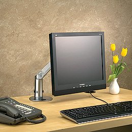 This is a beautiful ergonomic design with simple, intuitive movement - just move the monitor to where you want it - no buttons or levers. Vertical range of movement is 5" above and 5" below horizontal, and it extends 16" as well as folds flat for storage, giving more work space. Plus the monitor can rotate 360 degrees and tilt 185 degrees. The monitor clamp can rotate so the monitor can he held either portrait or landscape. It also has two cable clamps for integrated wire management. Arms attach to plates on back of most flat screen monitors, which must have the VESA 75 mm or 100 mm mounting pattern. Grommet hole mounting option. Weight capacity: 6 to 13 lbs. Finishes Available: Crystalite Chrome.